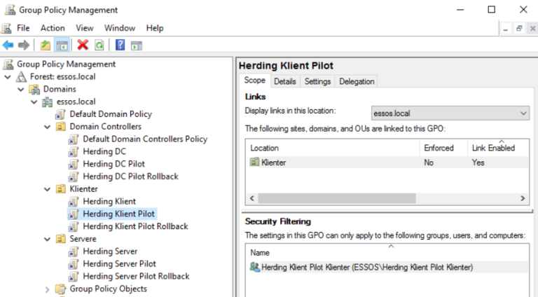Dersom det oppdages at det er problemer kan man da bare flytte alle klientene fra gruppen "Herding Klient Pilot Klienter" til gruppen "Herding Klient Pilot Klienter Rollback". Å ha en Rollback klar vil være nyttig for innstillinger som tatoveres i Windows, siden det ikke vil hjelpe å bare deaktivere slike GPOer.