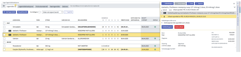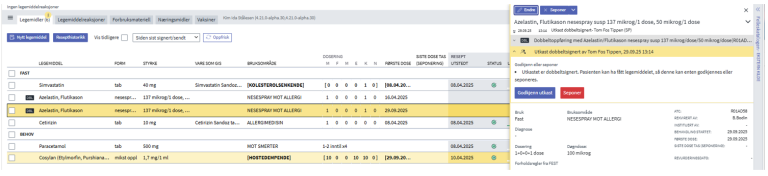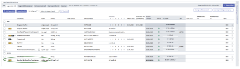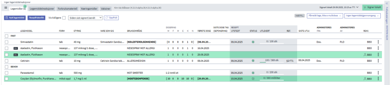 - grå oppføringer er oppføringer som ikke er seponert, og som ikke har aktiv resept. Men som er enten en utlevering på papir eller ferdigekspedert resept. Disse må bekreftes i bruk for å bli aktive behandlinger slik at de kommer over i datadelingsAPI`et til evt administrasjonsmodul.