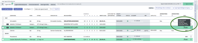 På grunn av endringer i funksjonalitet kan brukere oppleve at sjekkboksen ikke fungerer ved første oppslag på pasient. Bruker må da signere lokalt eller signere og sende. Ved signering vil tidligere oppføringer (grå) skjules, og nedtrekksmenyen for å velge tidsperiode kan deretter brukes. Det kan være noen avvik i valg i filter og hvilke tidligere oppføringer som vises på grunn av gamle data.