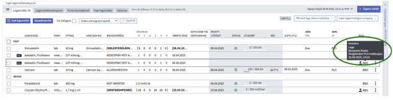 - «Signer og send». Om du ønsker å skrive en overordnet kommentar som ikke er knyttet til et konkret legemiddel, kan du bruke feltet som kommer opp ved signering, men dette er ikke påkrevd.