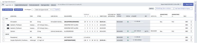 Når en lege utenfor din virksomhet har gjort endringer i pasientens legemidler, vises dette med fet skrift på det aktuelle legemiddelet. Dersom en lege utenfor din virksomhet har seponert et legemiddel vises dette som en grå oppføring med gjennomstreket skrift. Seponerte legemidler skjules fra legemiddellisten etter du har signert og sendt, men kan finnes igjen ved å hake på for «vis seponerte».